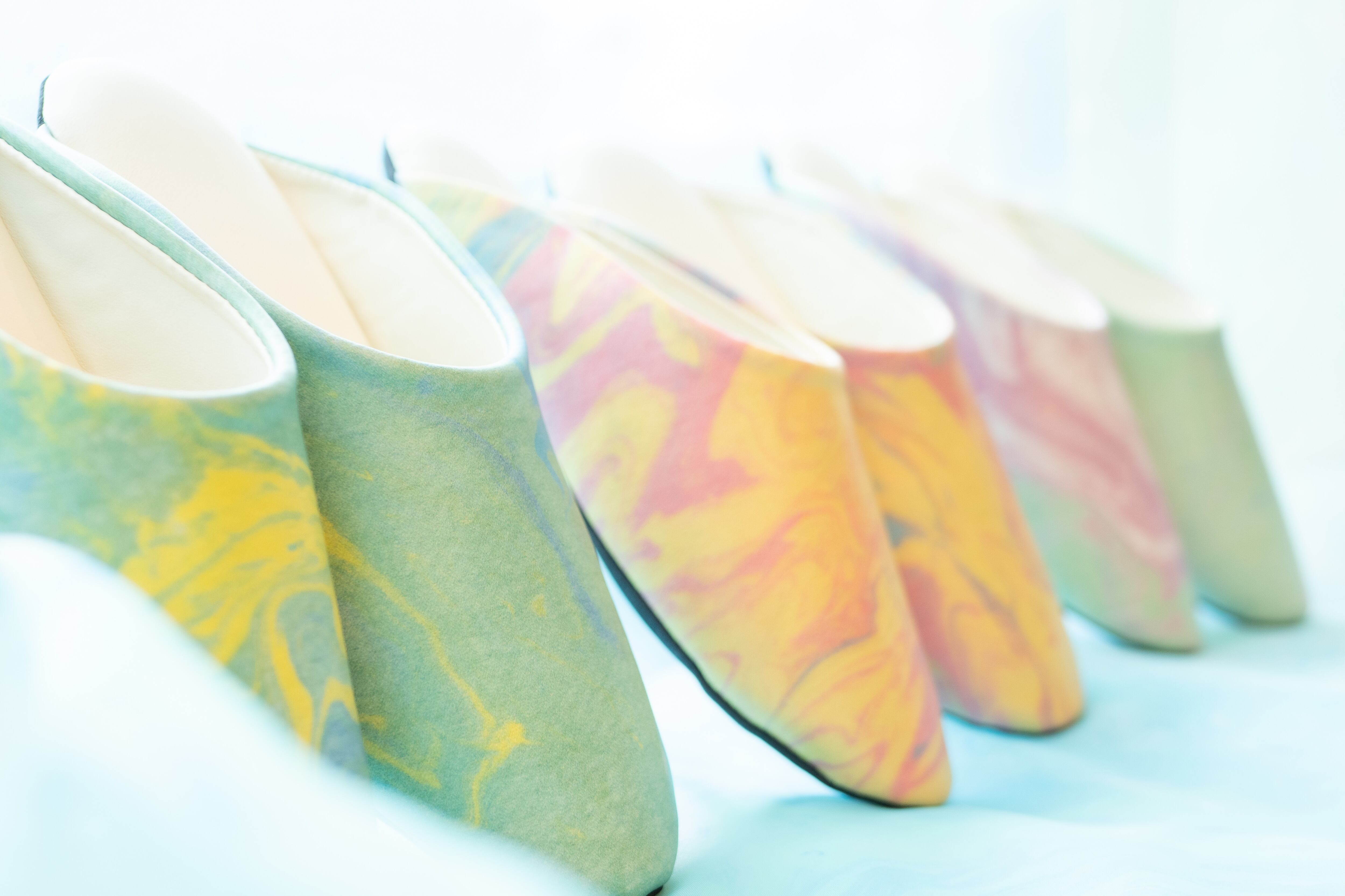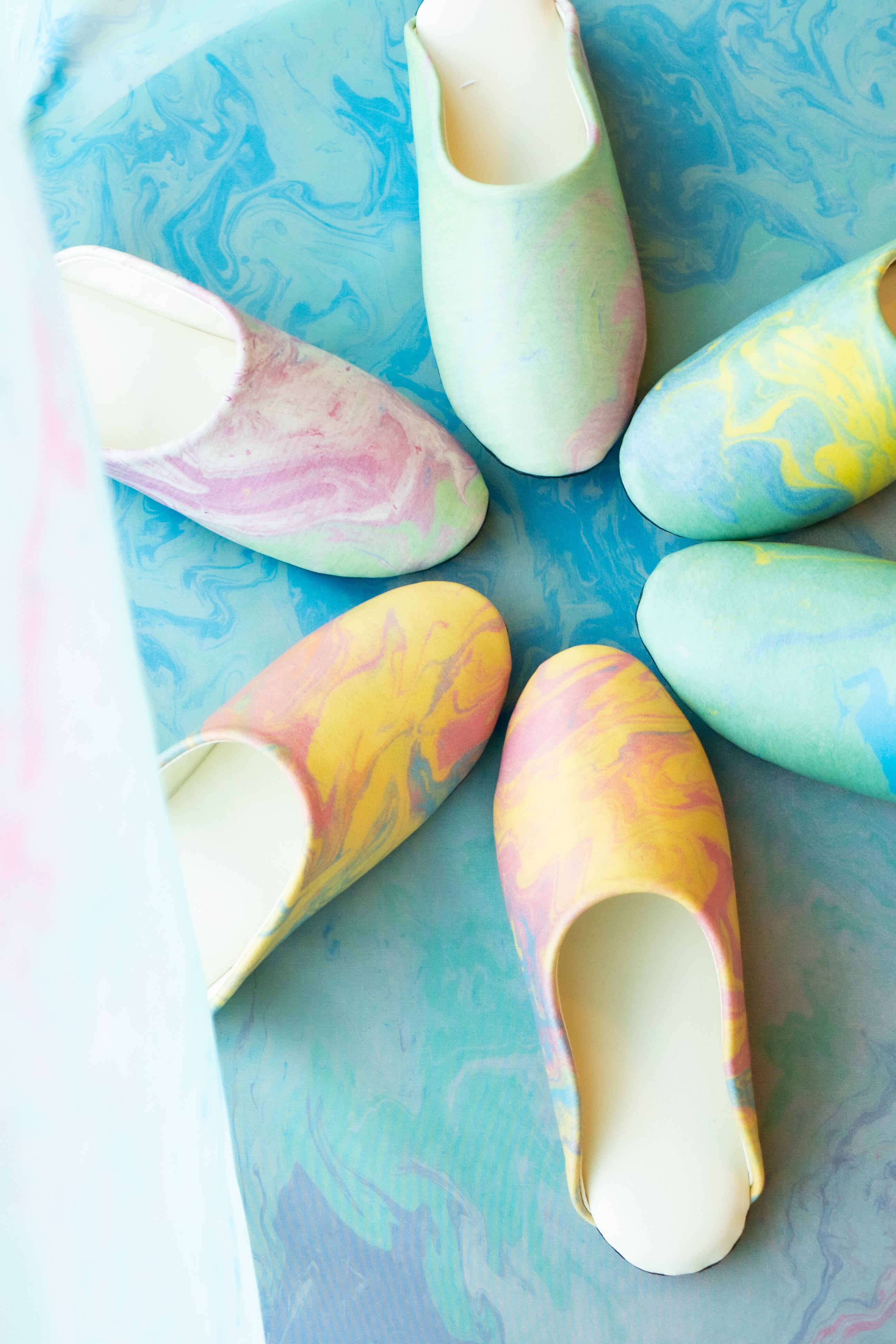 〜Keiko Koma selection 〜 水と光、風が偶然に写し出すマーブリング作品 水の上に絵具を落として白い生地を染め上げる製法のデジタル作品です。 どなた様にもお使いいただきやすい、マーブリングのスリッパです。撥水加工がしてあり、クッション性もあります。